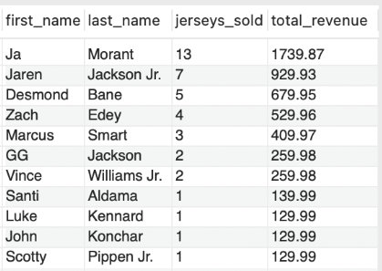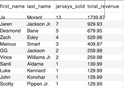 SELECT * FROM JerseySalesPerPlayer ORDER BY total_revenue DESC;