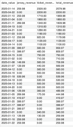 SUM(jersey_sales) AS jersey_revenue,