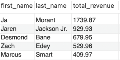 SELECT r.first_name, r.last_name, SUM(js.price) AS total_revenue FROM Jersey_Sales js JOIN Roster r ON js.player_id = r.player_id GROUP BY r.player_id ORDER BY total_revenue DESC LIMIT 5;